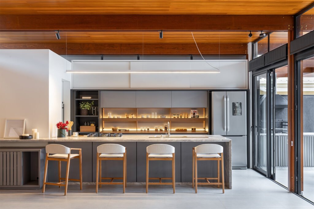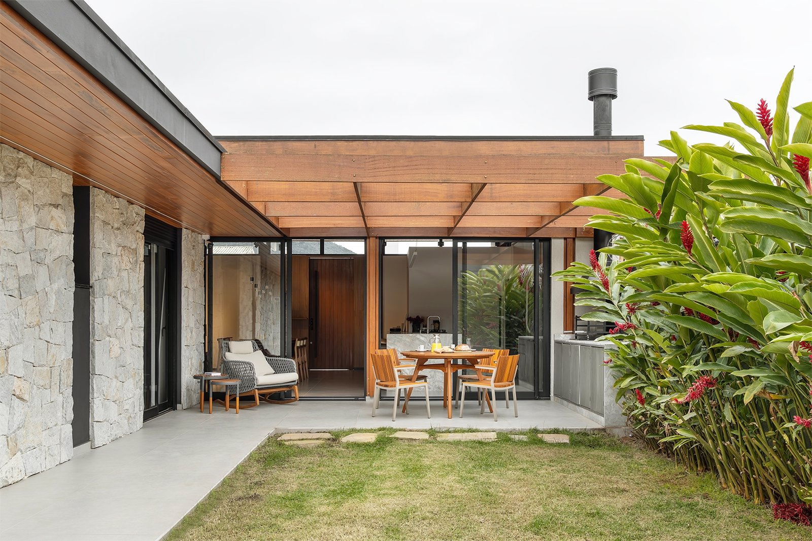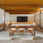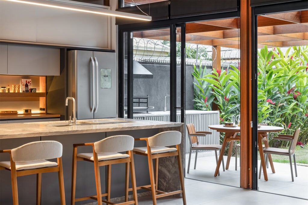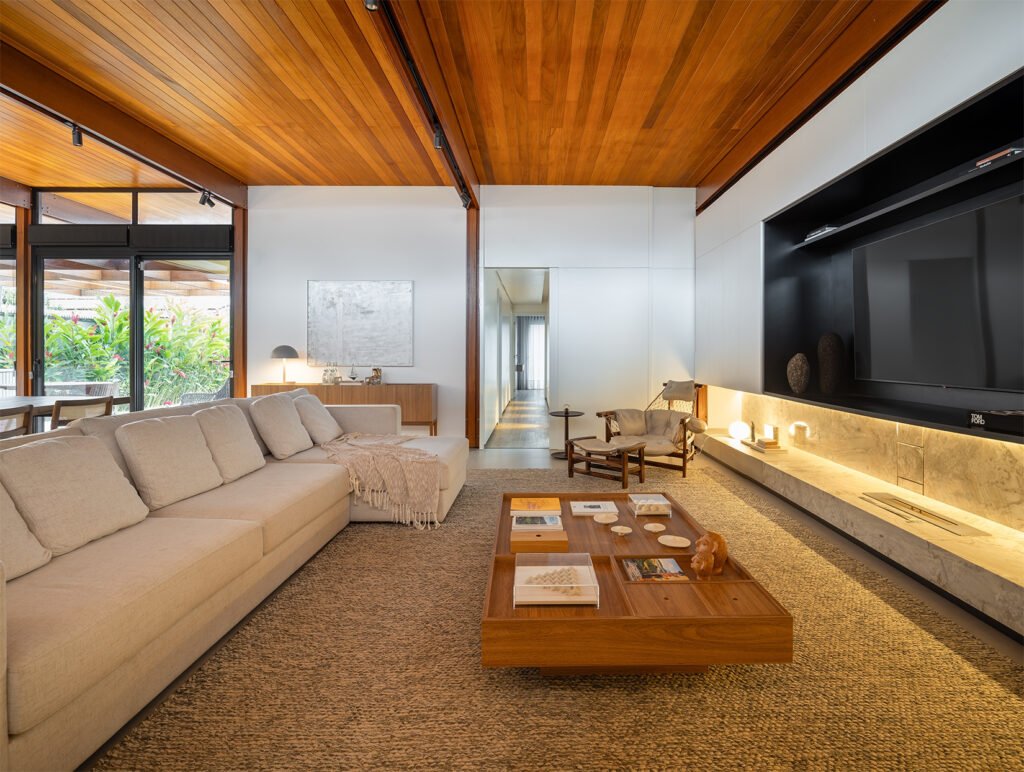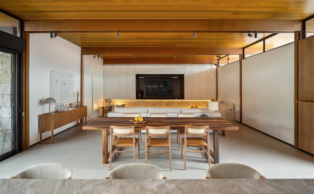 O projeto destaca-se pelo uso equilibrado de materiais naturais, como pedra e madeira cumaru, que aquecem os ambientes e conectam interior e exterior. A integração da área social e a generosa iluminação natural são pontos centrais, assim como o paisagismo que envolve a casa e suaviza sua presença urbana.