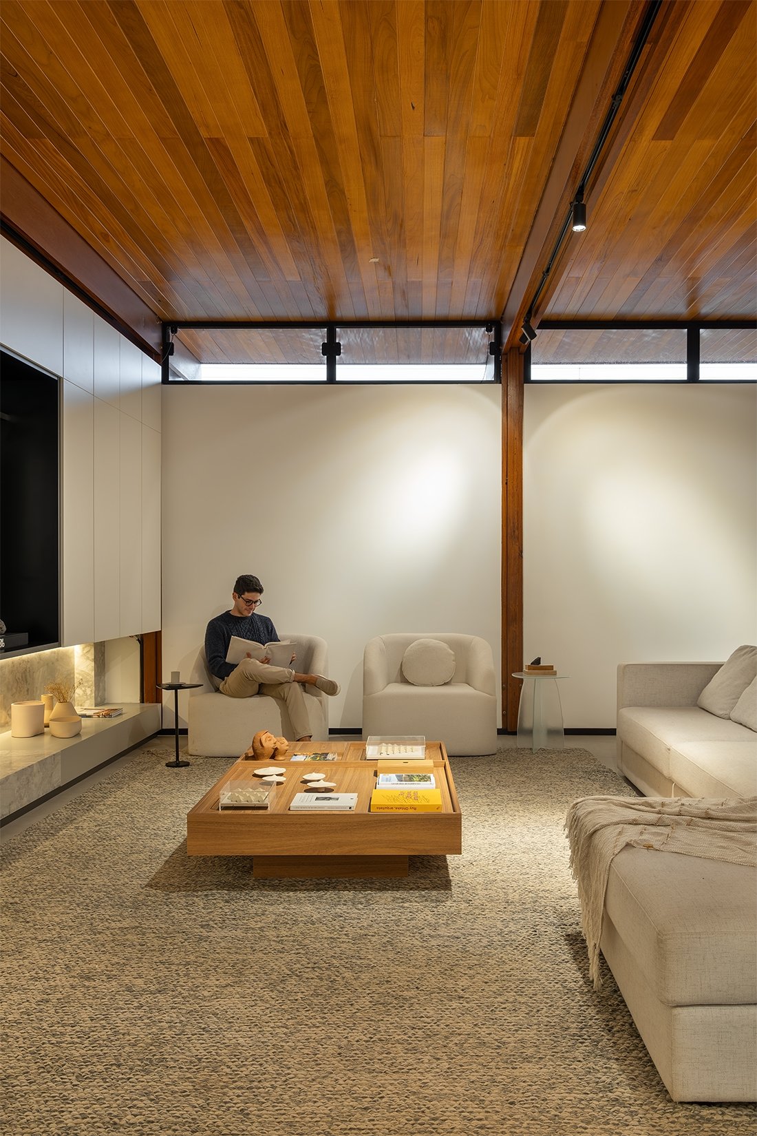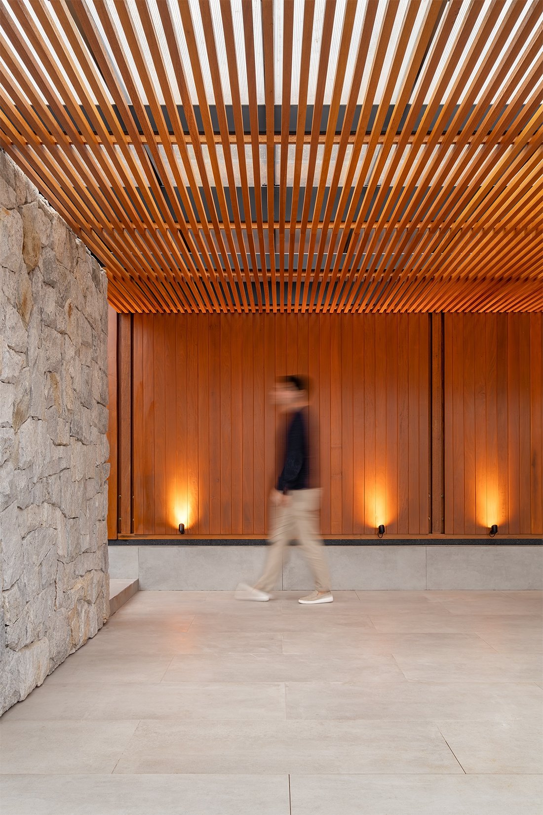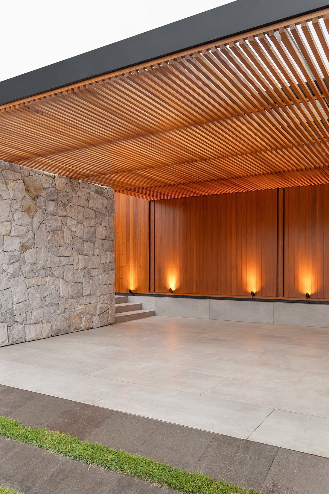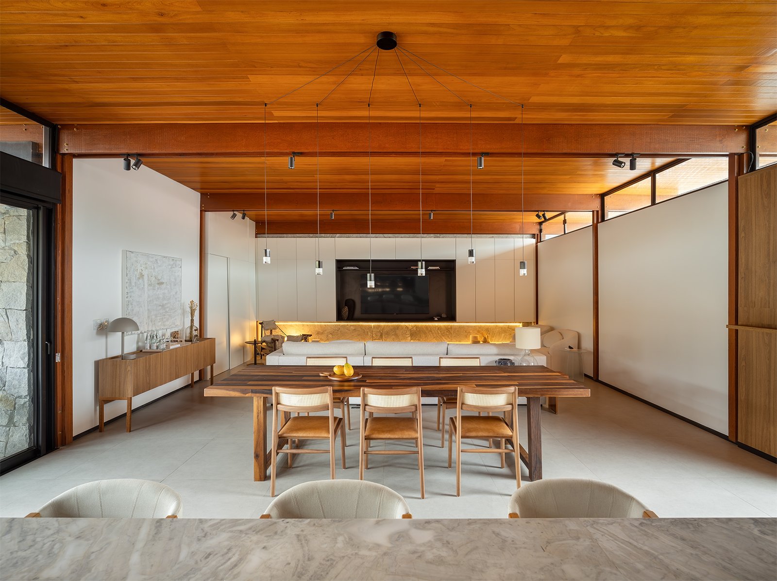 O projeto destaca-se pelo uso equilibrado de materiais naturais, como pedra e madeira cumaru, que aquecem os ambientes e conectam interior e exterior. A integração da área social e a generosa iluminação natural são pontos centrais, assim como o paisagismo que envolve a casa e suaviza sua presença urbana.