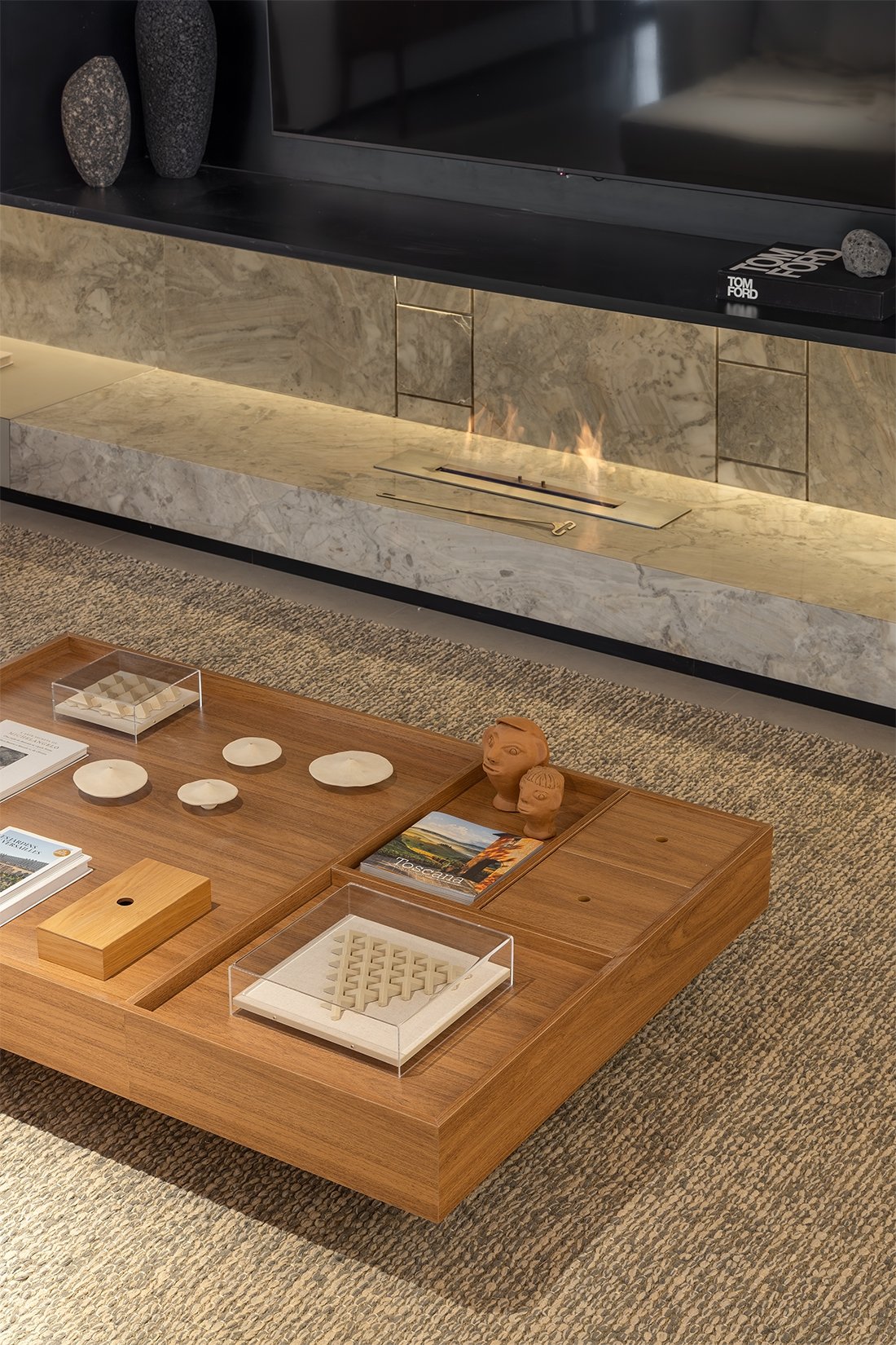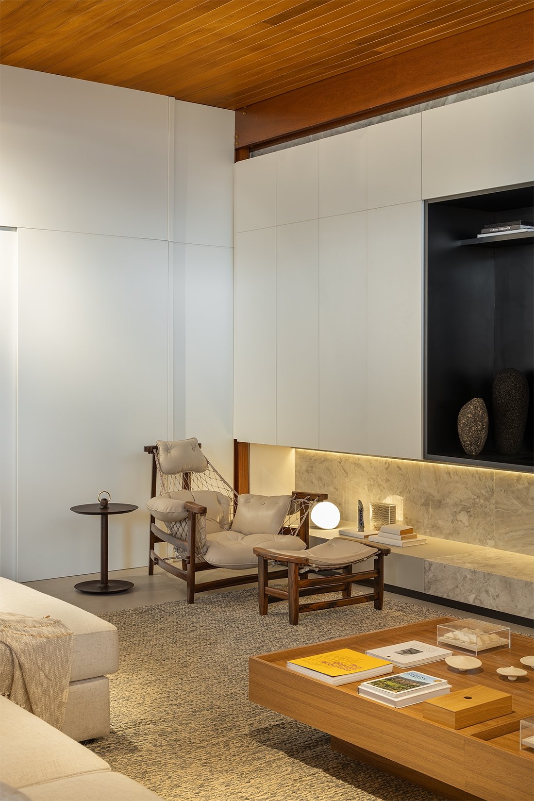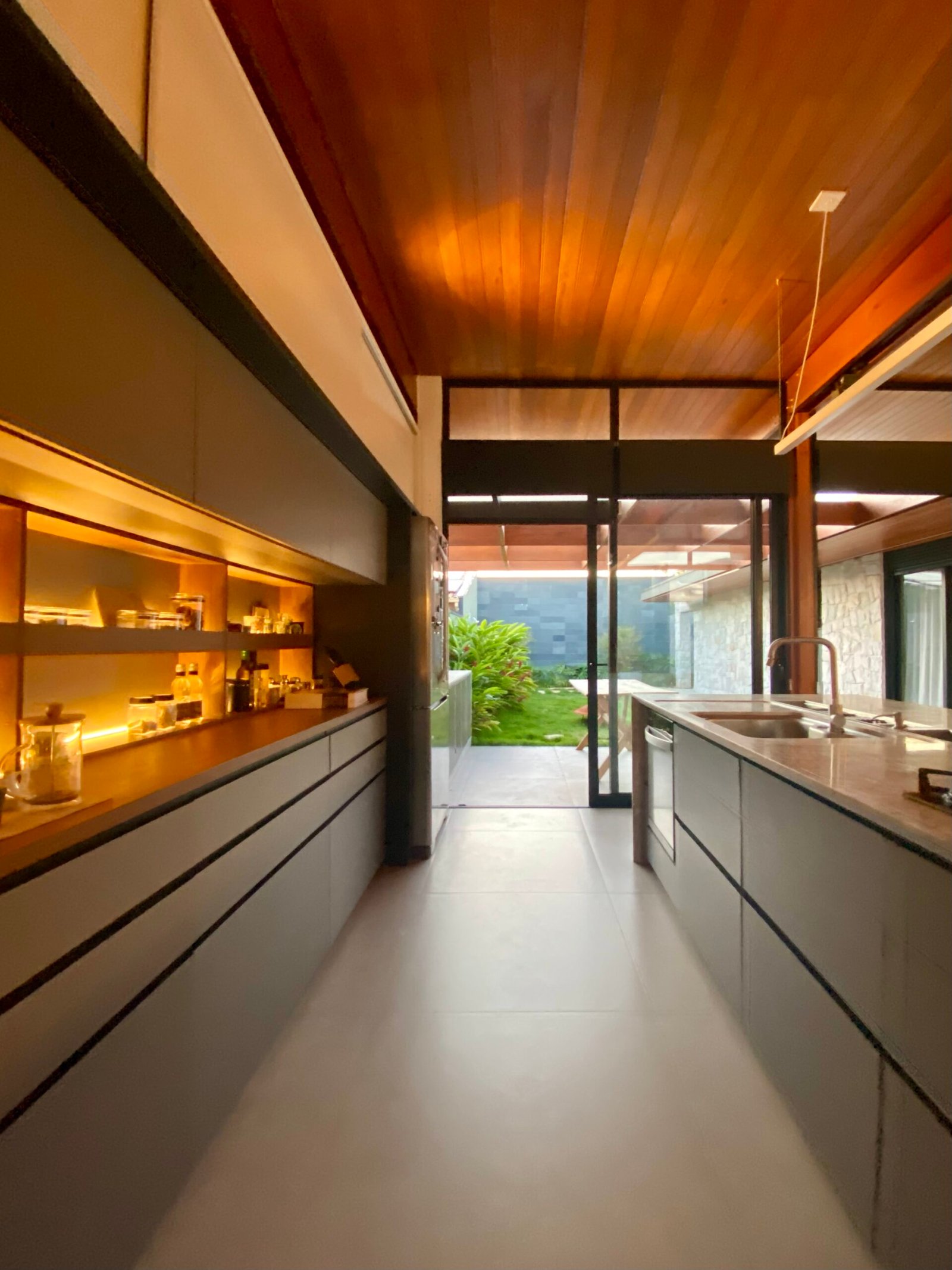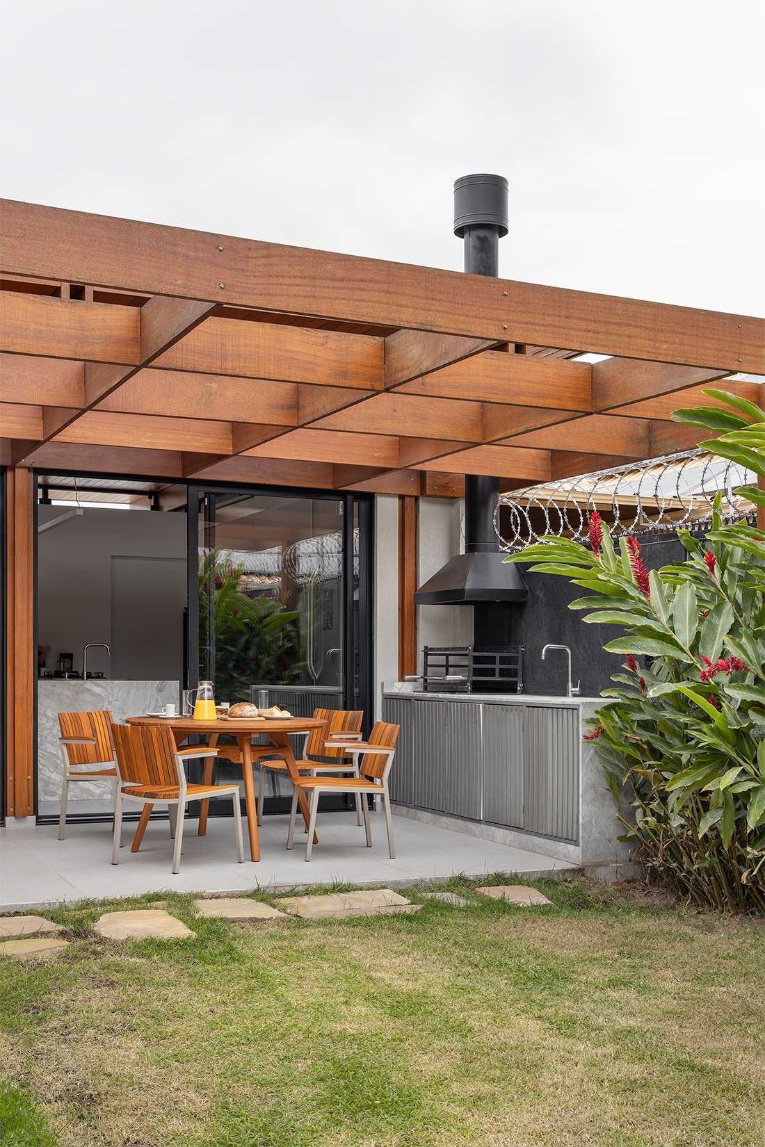 O projeto destaca-se pelo uso equilibrado de materiais naturais, como pedra e madeira cumaru, que aquecem os ambientes e conectam interior e exterior. A integração da área social e a generosa iluminação natural são pontos centrais, assim como o paisagismo que envolve a casa e suaviza sua presença urbana.