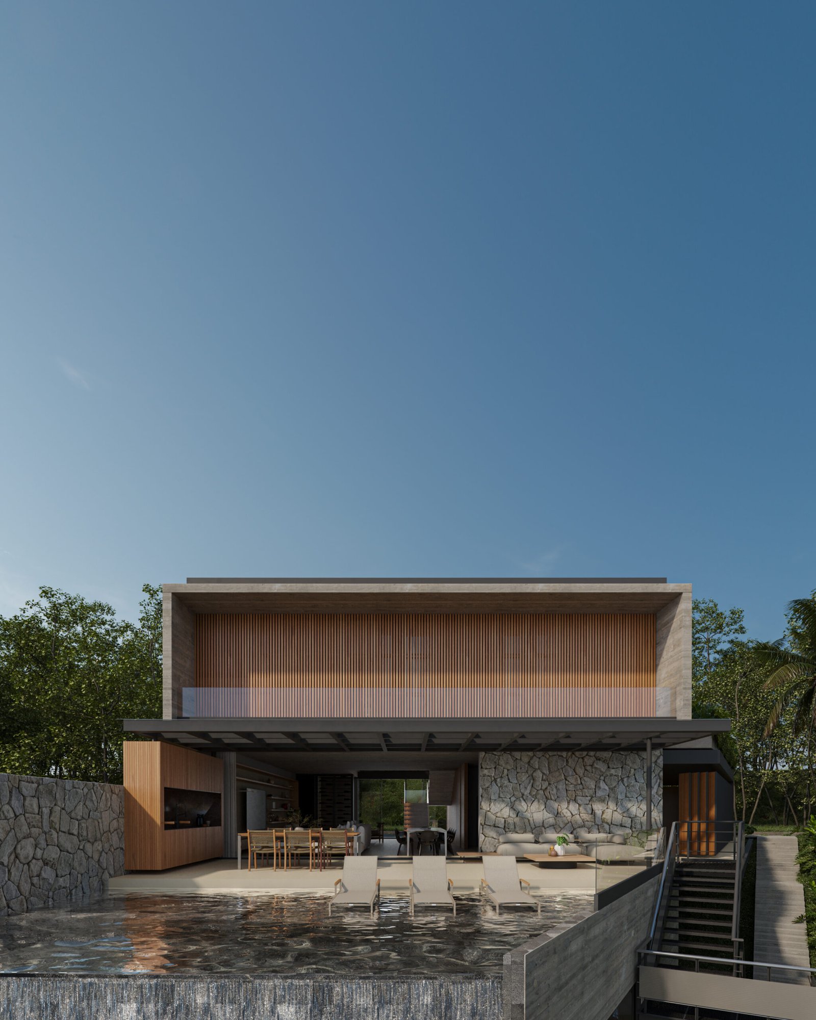 O pavimento superior, envolto por brises de madeira, garante privacidade e controle solar para os dormitórios, enquanto o térreo se abre totalmente para a área de lazer com piscina de borda infinita e integração total com a natureza ao redor. O uso de pedra natural nos muros de contenção e paredes internas reforça a identidade brutalista do projeto.